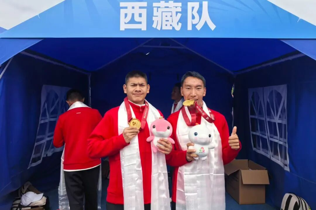 足球赛场捷报频传,布穷(右一)与洛松罗布(左一)携手发力,为昌都队摘得男子足球金牌。